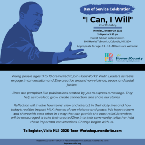 Youth ages 13-18 are invited to join HopeWorks’ Youth Leaders to engage in peer-led conversations and the creation of a zine promoting social justice, non-violence, and peace.